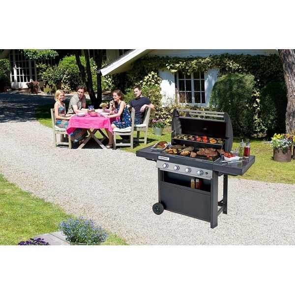 Avec son mode de cuisson 3 en 1 (50 % grill, 50 % plancha et fonction four), la préparation de vos repas devient un jeu d'enfant. Ce barbecue à gaz est équipé d'une surface de cuisson en acier double émaillage pour la partie plancha et grill de 3500 cm² (78 x 45 cm) + une grille de mijotage articulée.